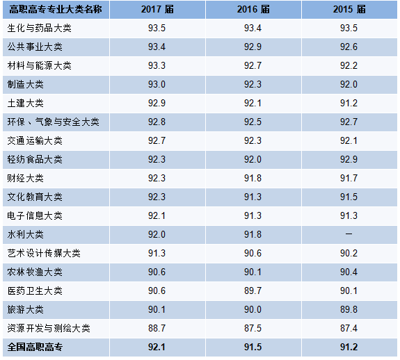 第三方社会调查机构麦可思日前在北京发布的《2018年中国大学生就业报告》(就业蓝皮书)显示,2017届大学生毕业半年后的就业率为91.9%,与2016届、2015届基本持平,其中高职高专就业率首次超过本科。