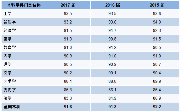 2017届本科毕业生半年后就业率最高的学科门类是工学(93.5%),其次是管理学(93.2%);最低的是法学(85.3%)。2017届本科毕业生半年后就业率最高的专业类是电气类(95.6%),最低的是法学类(85.3%)。2017届本科毕业生半年后就业率排前三位的专业是软件工程(96.7%)、能源与动力工程(95.8%)、电气工程及其自动化(95.6%)。